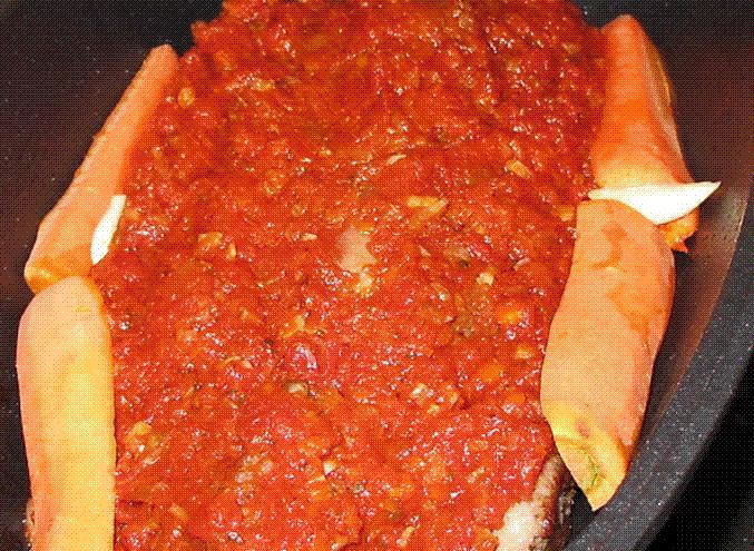 сначала приготовим соус. Для этого обжарить до золотистого цвета в сотейнике лук,чеснок и морковь. Затем влить туда протертые сквозь сито помидоры, добавить соль, специи и варить соус 15-20 мин до загустения, непрерывно помешивая. Убрать с огня.