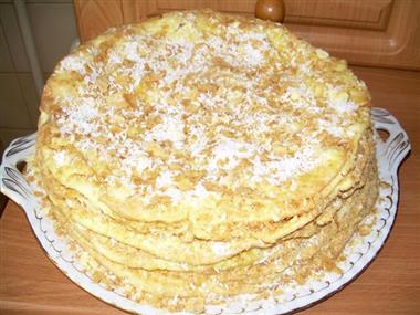 В просеянную муку положить масло и порубить его ножом. Затем понемногу добавлять воду, яйца и уксус. Начинаем вымешивать тесто, затем кладем его в холодильник на полтора- два часа. Потом достаем и делим на 16 частей, берем кусок фольги и раскатываем на ней тесто, отправляем в духовку, разогретую до 250 градусов и выпекаем минут 5-7, корж должен стать золотистым.