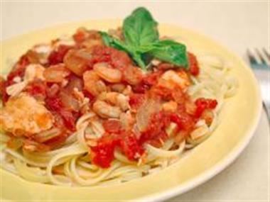 Одновременно в большом количестве подсоленной кипящей воды отварить лингвини (или спагетти, или любую другую пасту) на пару минут меньше того времени,что указано на упаковке.