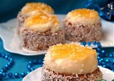 На смазанные сгущёнкой пирожные осторожно выкладываем из формочек желе и посыпаем кокосовой стружкой.Получаются "цветы под снегом"
