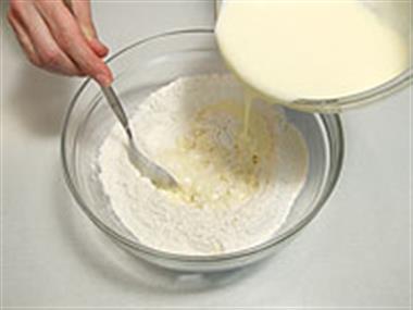 Получившуюся смесь постепенно вливаем в муку,и тщательно