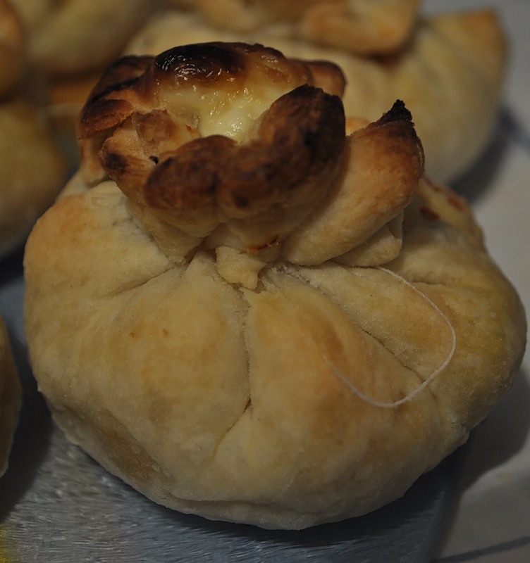 Отварить куриное филе, мелко нарезать, добавить майонез, размешать. Натереть на мелкой терке сыр, добавить тертого чеснока, размешать с майонезом. Слоеное тесто раскатать, нарезать на квадратики размером 15х15. В середину квадратика класть 1-2 столовых ложки курицы с майонезом. Сверху - тоненький ломтик помидора. А по верх всего - тертый сыр с чесноком и майонезом. Сформировать из слоеного квадратика мешочек-узелок, завязав его сверху грубой ниткой или пером зеленого лука. Завязывать осторожно, чтобы не прорвать тесто. Узелки разместить на противне, смазанный растительным маслом. Обмазать слоеные узелки сверху взбитым яйцом. Запекать в духовке при температуре 180 градусов, пока не подрумянятся.