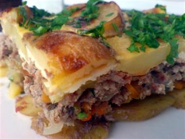 Возьмём следующие ингредиенты: 200 грамм мяса, 2 яйца, 200 грамм картофеля, 100 грамм помидоров свежих , 400 мл молока, 20 грамм томатным соусом, 50 грамм муки, 100 грамм сливочного масла, 50 грамм лука, перец и соль.