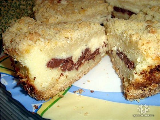 | Рецепт приготовления блюда: | Все просто и быстро! Главное в конце! Сливочное масло потереть на крупной терочке. Добавить сахарок, муку, соду и растереть все ингредиенты в крошку. Для начинки размять вилочкой творог, сахар, яйца. Вмешать туда ванилин и квадратики шоколада 1см х 1см. Форму застелить бумагой для выпечки. Выложить в форму половину крошки, разровнять, положить начинку и сверху вторая половина крошки. Нагреваем до 200 градусов духовку, ставим торт. Выпекаем 40 минут, тортик должен зарумяниться. Не пугайтесь, если вам покажется, что он внутри еще жидкий, это нормально. Достаем, остужаем при комнатной температуры, а потом, внимание, вот оно главное! обязательно ставим в холодильник до полного остывания! Вот и все! Приятного аппетита Вам! |