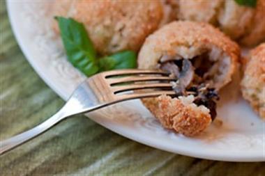 Сделать из риса и грибов шарики, обмакнуть их в яйцо, затем обвалять в сухарях.