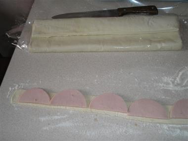 Режем колбасу тонкими половинками круга и выкладываем так, чтоб они чуть выступали над тестом.