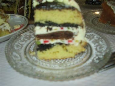 Перемазывать коржи кремом, на крем резать тоненькими пластинками мармелад.