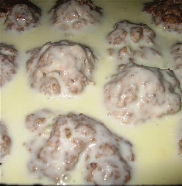 Размочить чёрствую булочку, перемешать с рубленым мясом (желательно свининой), добавить луковицу, порезанную кубиками, яйцо и горчицу. Из этого фарша сделать биточки и варить из в воде, пока всплывут. Отвар, который получится из воды отлить для соуса (500 грамм).